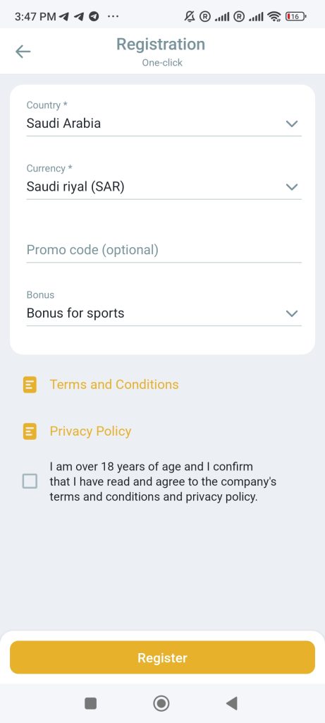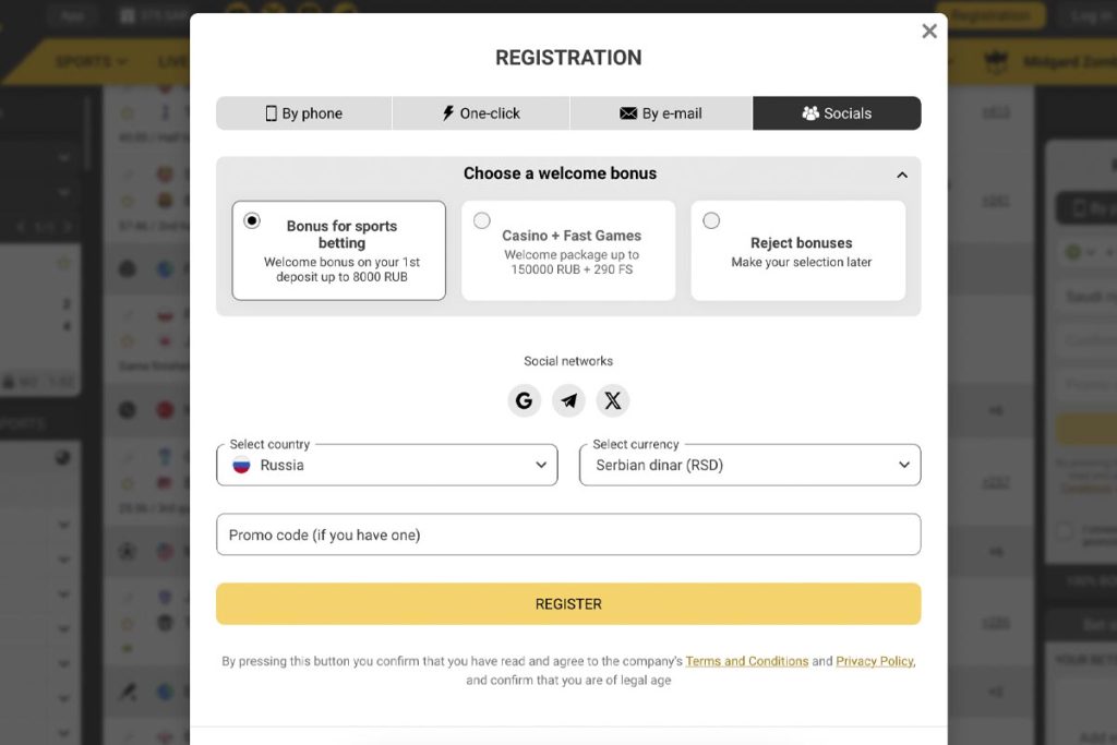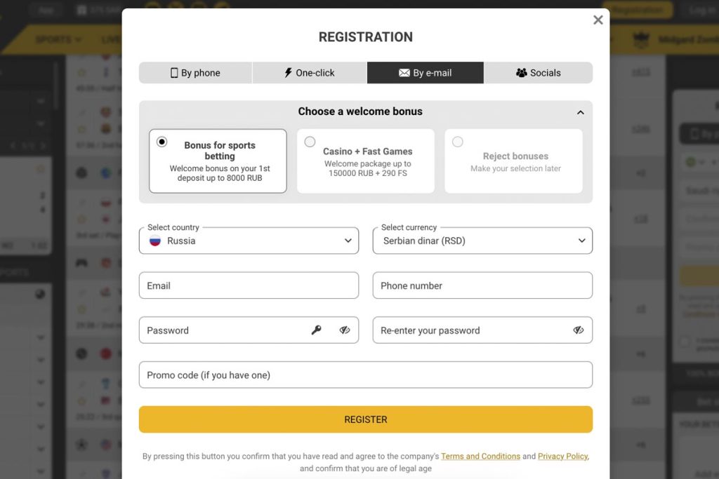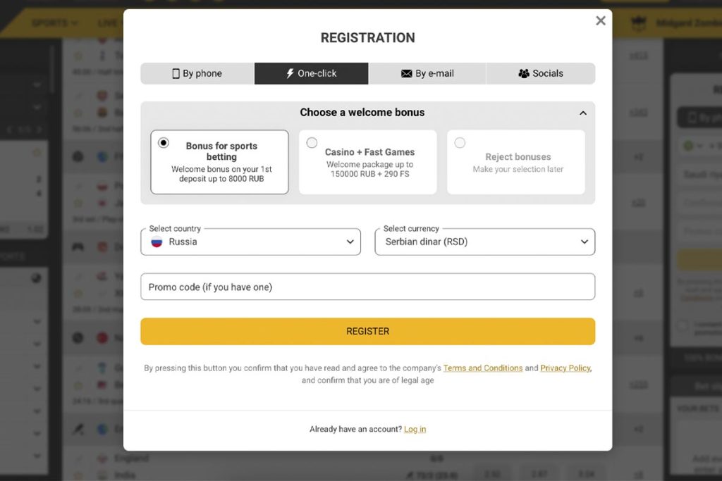 One-click registration. The fastest way to create an account and make a deposit as soon as possible. All you need to do is enter the SITEBONUS promo code and choose the type of bonus to receive up to 100% benefit to the first top-up as a gift. The country and currency are determined automatically. After creating your account, you will receive a username and password that you need to save for further access to your profile.